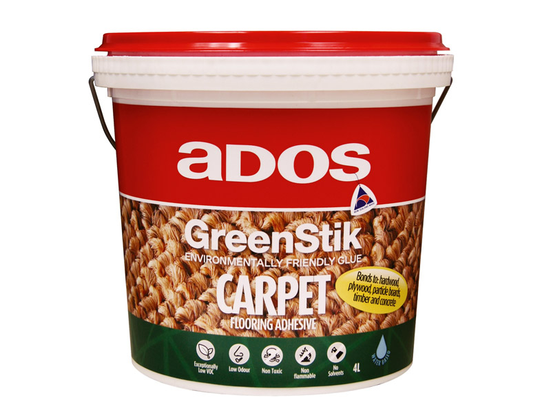 The ADOS GreenStik Carpet Flooring Adhesive is a high viscosity, low slump product with long tack off formulated for use on all carpet types including foam backed carpets and foam rubber underlays. It provides superior adhesion to most flooring substrates such as hardwood, plywood, particle board, timber and concrete including unsealed timber, porous surfaces and surfaces with slight imperfections.